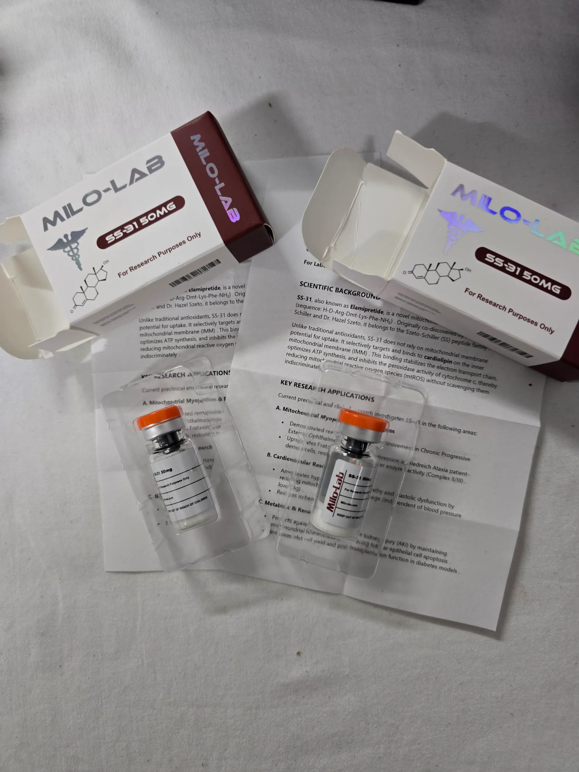 SS-31 50mg by Milo-Lab is a revolutionary mitochondrial-targeted peptide designed to support cellular energy, combat oxidative stress, and promote healthy aging. Known scientifically as Elamipretide (also referred to as MTP-131 or Bendavia), SS-31 is a synthetic tetrapeptide that selectively targets the inner mitochondrial membrane. By binding to cardiolipin, it optimizes electron transport chain efficiency, preserves ATP production, and reduces reactive oxygen species—making it a powerful tool for those seeking to enhance metabolic health, cognitive function, and physical resilience